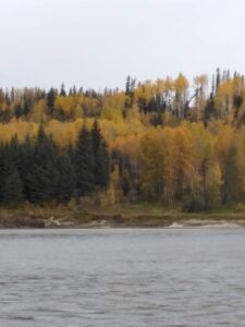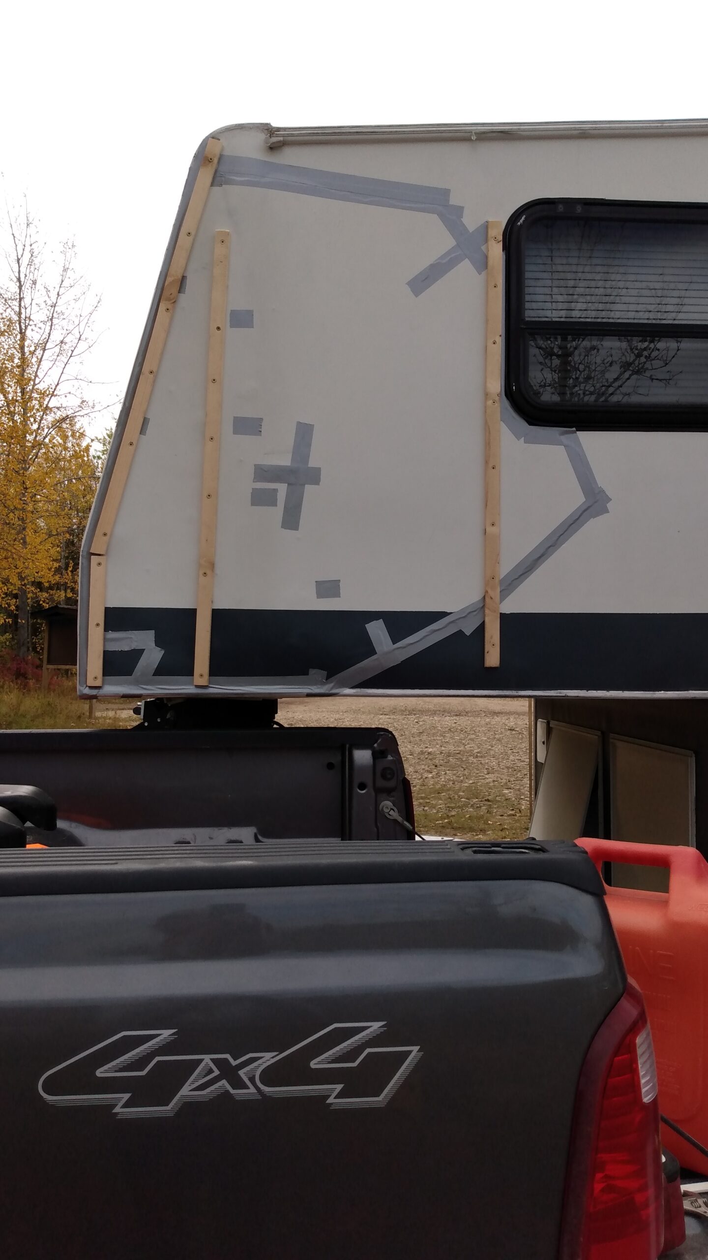 We were all packed and ready to head out with our B Train (one ton truck, 5th wheel and flat deck carrying our side by side) on Fri., Sept. 23, 2022. I had to return on Sunday to get a delivery of plants out for the TransEd project Monday morning and check on our critters, so I followed Steve in my Rogue. Our final destination was just south of Fox Creek, but since we left later than we had hoped and it was getting dark, we opted to pull in at the Nakoda gas station and stay there for the night, along with all the big rigs. All was good when we headed out again Sat. morning until the wind picked up on the highway. From my vantage point in the rear I could see a piece of the fiberglass siding at the front corner of the fifth wheel flap, and then fly right off, along with some insulation across two lanes and into the median. Steve saw it too so we pulled over to the shoulder to assess the situation. Some of the vehicles moved to adjacent lanes and/or slowed down as they passed, but others did not, making for a less than optimal place to try have a look at the trailer. The damage of course, was on the driver’s side. From the inside I could practically stick my hand through my closet space in the bedroom area – I had visions of my underwear flying along the highway, but thankfully I had not lost any clothing. Steve opted to unhook and run to the nearest town for supplies, while I waited in the trailer. I could feel the trailer shudder at every wind gust and semi that blew by. Steve returned after some time with some screws, bolts, lath and a sheet of puck board. Miraculously he had also salvaged the insulation and fiberglass from the median. Of course they gave him the wrong screws at the hardware store so he went back a second time. Upon his return we opted for a quick patch with some lath screwed to the side until we could get somewhere a bit safer. It was a bit nerve-wracking for me to yell, “Truck!” for almost every other screw, at which point Steve would have to scoot over to avoid potentially becoming human asphalt.
